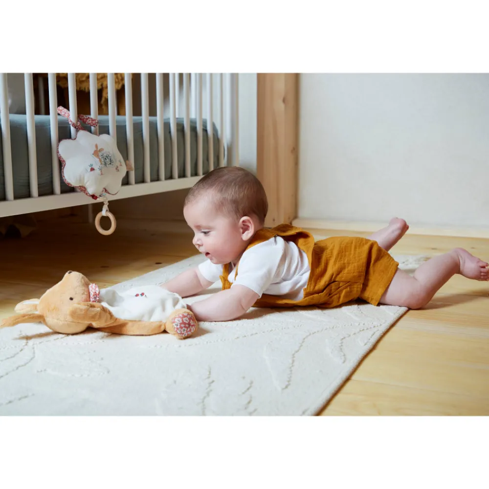 Chantez La Comptine « Mon Petit Lapin » En Musique Avec Ce Coussin Musical Pour Bebe. Une Adorable Boite A Musique En Tissu A Suspendre Pres De L’Enfant Grace A Ses Rubans, Pour Une Touche Melodieuse De Douceur Au Quotidien. Il Suffit De Tirer Sur L’Anneau En Bois Pour Que La Comptine Demarre Et Stimule Tous Les Sens Du Tout-Petit : Eveil Musical, Developpement Du Langage Et De L’Imagination … Ce Coussin Musical Brode Sur Le Theme De « Mon Petit Lapin » Est En Popeline Et Compose De Rembourrage En Polyester Recycle Certifie Grs. L’Anneau En Bois De Hetre Est Facile A Saisir Par Les Petites Mains De Bebe, Qui Prendra Plaisir A Utiliser Sa Jolie Boite A Musique Lui-Meme En Grandissant. Facile D’Entretien, Le Coussin Contient Un Boitier Musical Etanche Et Se Lave A La Main En Surface. Adapte Des La Naissance, Ce Coussin Musical Trouvera Sa Place Pres De La Table A Langer, Du Parc Ou Du Lit De L’Enfant Pour Rythmer Ses Journees Et Le Distraire En Musique. Son Format Compacte (15 Cm) Permet De Le Deplacer Aisement Pour Accompagner Le Tout-Petit Dans Toutes Ses Activites. Ideales Pour Accompagner Bebe Vers Un Doux Sommeil, Les Comptines Favorisent Egalement La Creation Du Lien Entre L’Enfant Et Les Parents : Chantez Ces Petites Chansons Avec Lui Et Profitez D’Un Tendre Moment Privilegie !