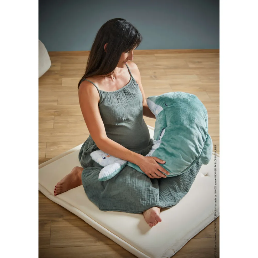 Des Les Premiers Jours Du Nourrisson, Les Parents Peuvent Utiliser Le Dauphin En Peluche Comme Support Pour Soutenir Le Dos Et La Tete De Bebe Quand Il Passe Du Temps Sur Son Tapis D’Eveil. La Forme De La Peluche A Ete Pensee Pour Envelopper L’Enfant D’Une Douceur Rassurante, Mais Aussi Pour Epouser La Forme Arrondie Du Ventre De Sa Maman, Ce Qui En Fait Un Support Ideal Pour Nourrir Bebe.